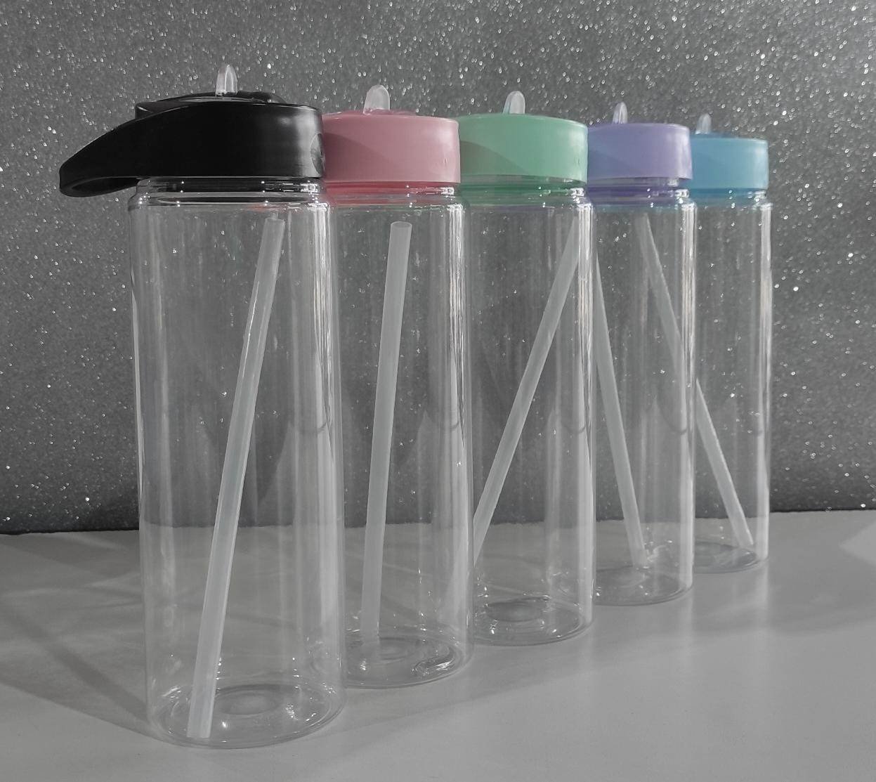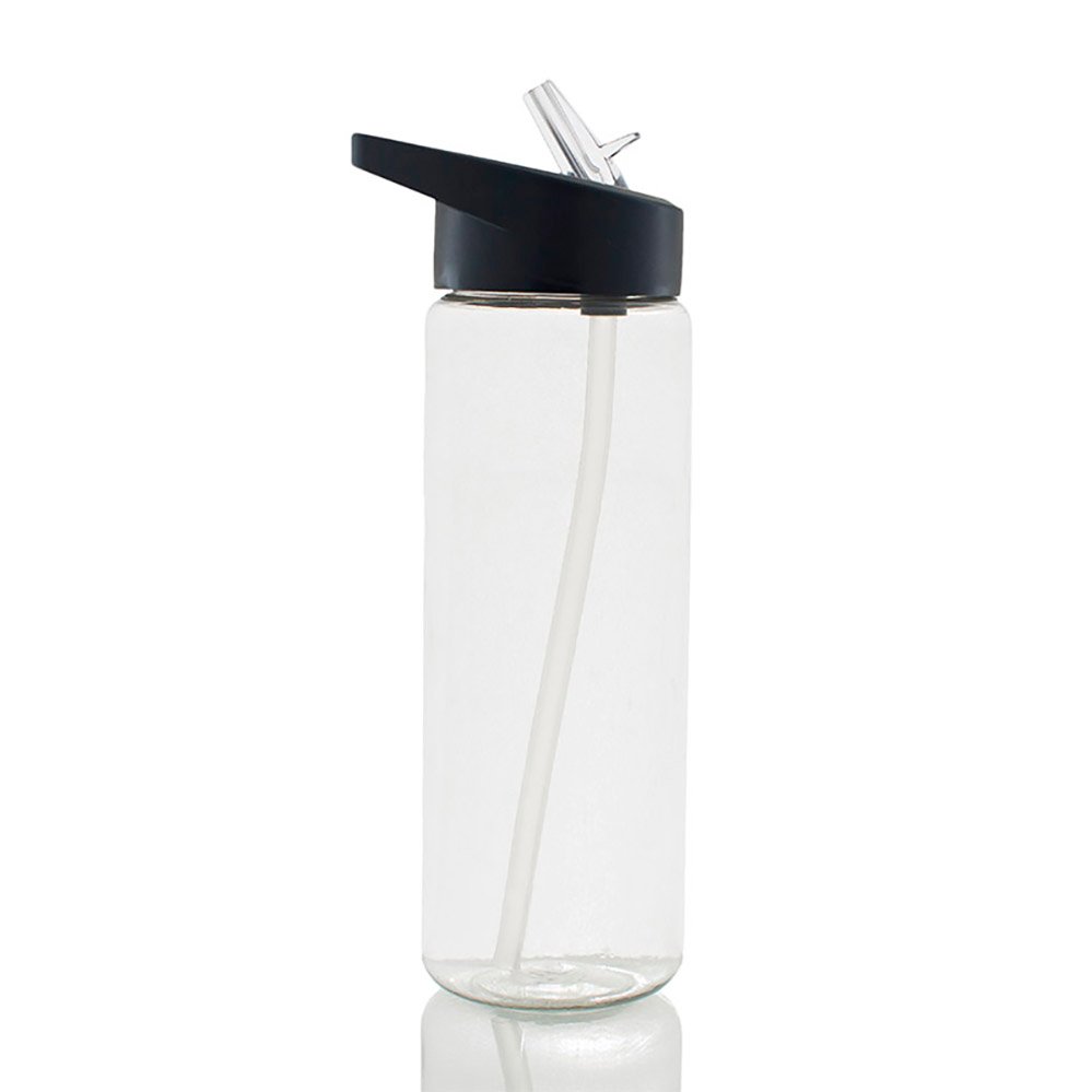 Botella plástica transparente con bombilla y tapa color a elección con pico rebatible.