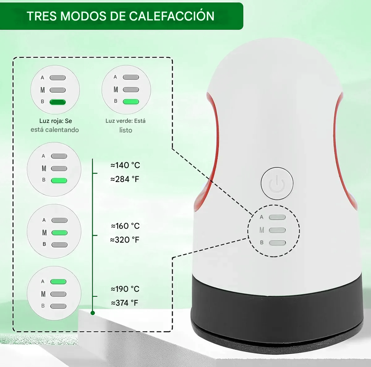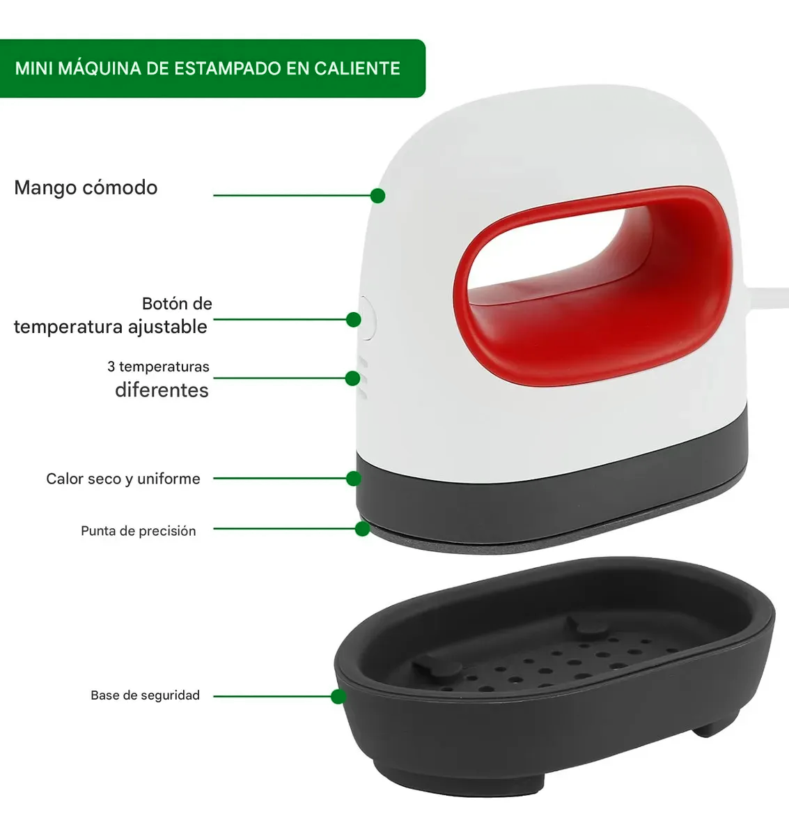 - Superficie teflonada que evita que el estampado se adhiera y facilita un deslizamiento fluido sobre la tela.